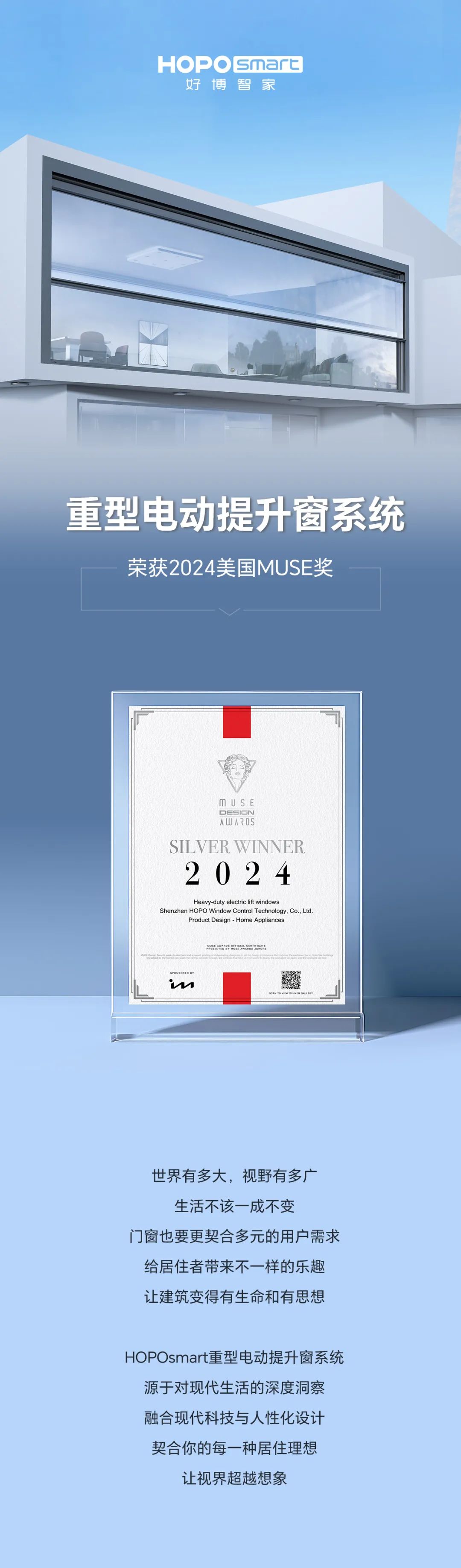 好博smart重型电动提升窗系统荣获2024 美国MUSE奖